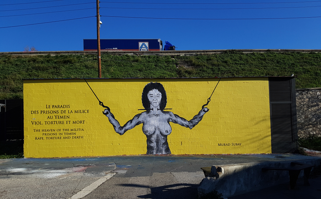 أهدى “مراد” هذه الجدارية إلى “كل الضحايا الذين تعرضوا للتنكيل” في الجحيم اليمني.