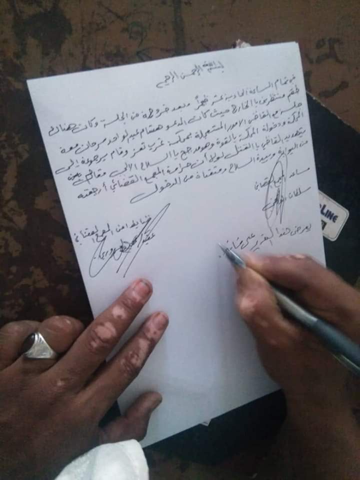 وحصلت “الشارع” على صورة من محضر اثبات الحادثة، يحوي إفادة أحد ضباط حراسة المجمع القضائي يقول فيها :” في تمام الساعة الحادي عشر ظهراً واثناء خروجه  من الجلسة وكان هناك طقم جنود منتظرين له في الخارج ،حيث كان المدعو هشام عبدالواحد سرحان لديه جلسة عند القاضي خاصة بالأمور المستعجلة بمحكمة غرب تعز، وقام برجوعه إلى المحكمة للدخول بالقوة وهو مدجج بالسلاح (الآلي) وقام بتهديد القاضي  بالقتل لولا أن حراسة المجمع القضائي أرجعته وبيده السلاح ومنعناه من الدخول”.