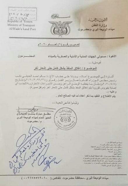 وكشفت مذكرة صادرة عن إدارة الميناء الوديعة البري إنه حسب توجيهات نائب رئيس الوزراء القائم بأعمال وزير النقل سالم الخنبشي، عبر مذكرة رسمية بعثها إلى إدارة المنفذ، أمر بإغلاقه حتى إشعار أخر.