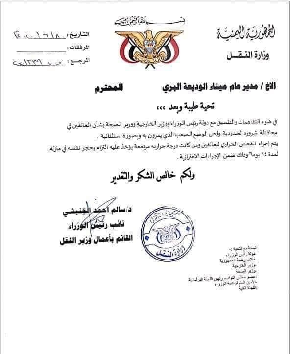 وأكد الخنبشي في مذكرته الموجهة إلى إدارة منفذ الوديعة أن هذا الإجراء أُتخذ على ضوء التفاهمات والتنسيق مع رئيس الوزراء ووزيرا الخارجية والصحة على أن يتم إجراء الفحص الحراري للعالقين في منطقة شرورة الحدودية لحل الوضع الصعب الذي يمرون به وبصورة استثنائية.