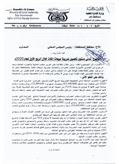 في مذكرة للشؤون القانونية في مكتب ضرائب تعز، بتاريخ 9 أبريل 2020م، إلى مدير عام مكتب الضرائب، أوضحت أنه “من خلال الاطلاع على الحصيلة الشهرية للربع الأخير من عام 2019م (أكتوبر ـ نوفمبرـ ديسمبر) بلغت مبلغاً قدره (71.250.190) ريال، بينما إجمالي الحصيلة الشهرية للربع الأول من عام 2020م (يناير ـ فبراير ـ مارس) بلغت مبلغاً قدره (58.235.325) ريال، وهذه أرقام صادمة ولا تساوي نسبة 50% للحصيلة التقديرية التي أقرها المكتب بالمزايدة في منتصف عام 2019م”.
