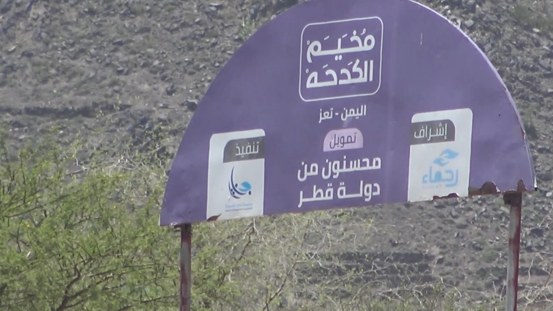 في بداية “مخيم الكدحة”، تنتصب على الشارع الرئيسي العام لوحة إعلانية دعائية مكتوب عليها اسم هذا المخيم، والكلمات التالية: “إشراف- تمويل- تنفيذ: محسنون من دولة قطر”.