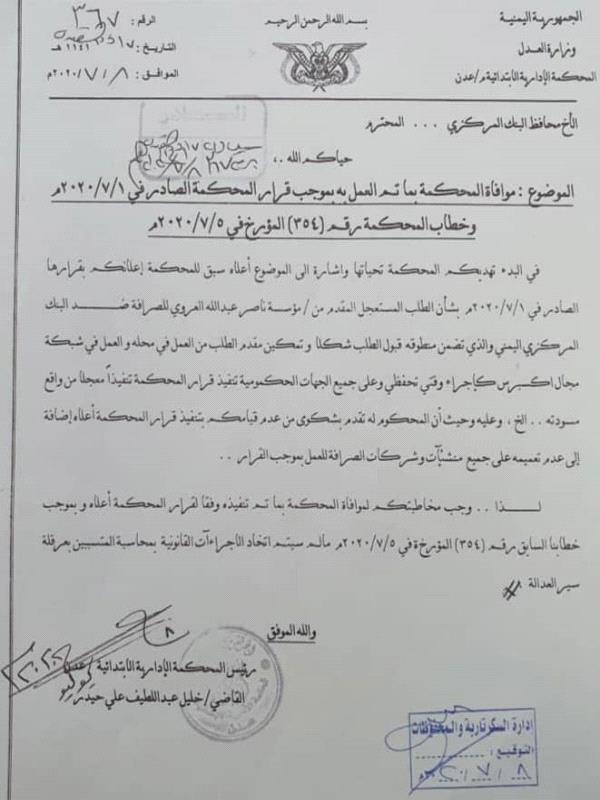 وجهت المحكمة الإدارية في مدينة عدن، مذكرة إلى البنك المركزي اليمني لموافاتها بما تم تنفيذه، من قرار المحكمة بتاريخ ١ يوليو الجاري، ومذكرتها بتاريخ ٥ يوليو الجاري.