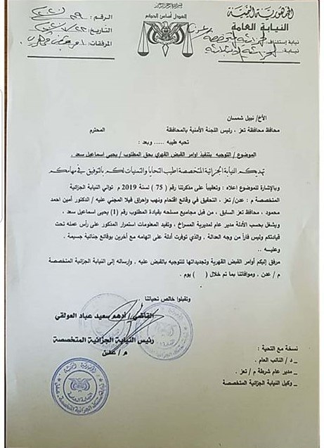 وطالب رئيس النيابة أواخر الشهر الماضي محافظ تعز نبيل شمسان، بتنفيذ أوامر القبض القهري الصادر بحق القيادي الاخواني حيى إسماعيل سعد، مدير مديرية المسراخ، الصادرة من النيابة بحق المذكور مطلع يوليو من العام الماضي بتهمة اقتحام ونهب منزل محافظ تعز السابق امين محمود.