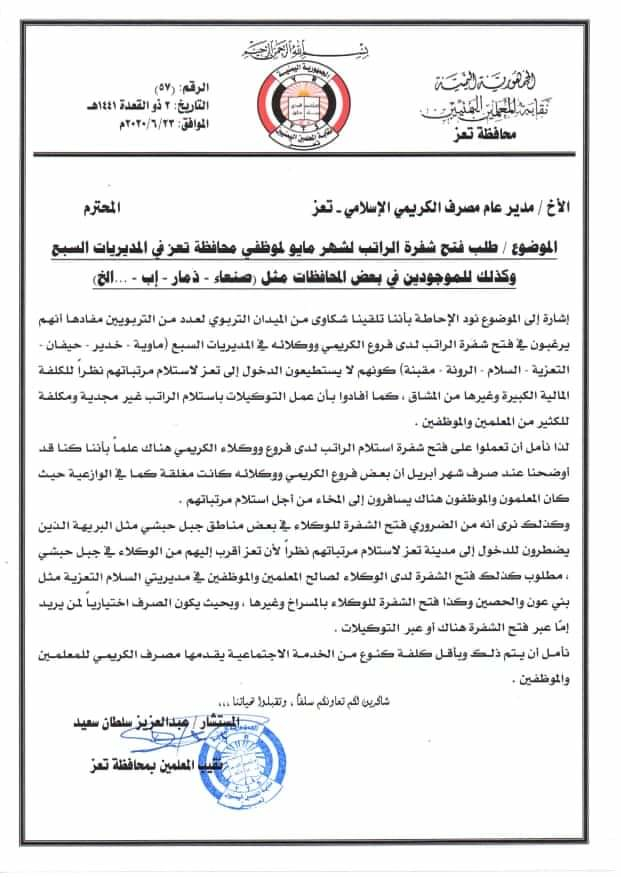 نقابة المعلمين حررت بهذا الصدد رسالة إلى مصرف الكريمي، في الـ23 من يونيو الماضي، خاطبت فيها الكريمي، وطالبته فتح شفرة الراتب لدى فروع الكريمي ووكالاته السبع، كونهم لا يستطيعون الدخول إلى تعز لاستلام مرتباتهم، نظراً للكلفة المالية الكبيرة.
