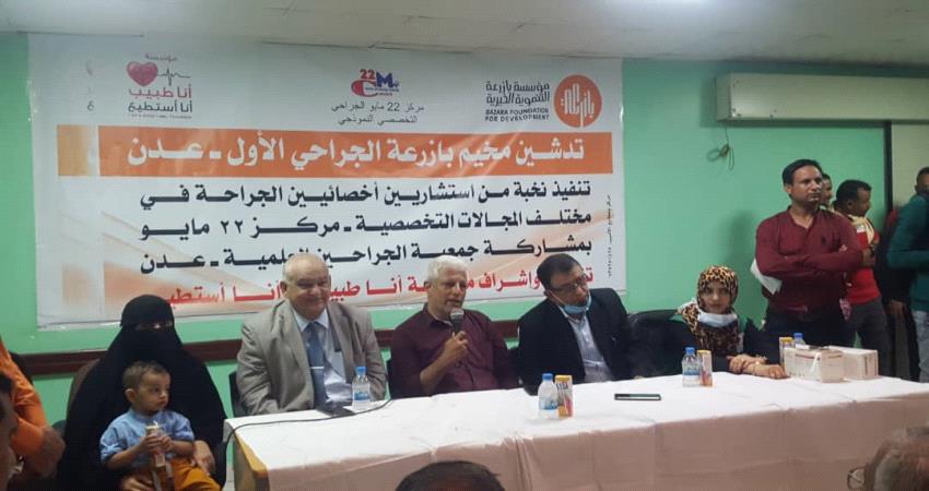 دشّن مخيم بازرعة الجراحي الأول، في مدينة عدن، عمله في مستشفى 22مايو، الأحد، بحضور ومشاركة نخبة من استشاريي الجراحة في مختلف المجالات التخصصية.