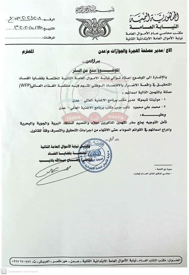ووجهت نيابة الأموال العامة في عدن، مذكرة إلى مصلحة الهجرة والجوازات، أمس الأول، تطالب بمنع مدير مكتب برنامج الاغذية العالمي ونائبه من السفر، على خلفية تورطهم بقضايا فساد.