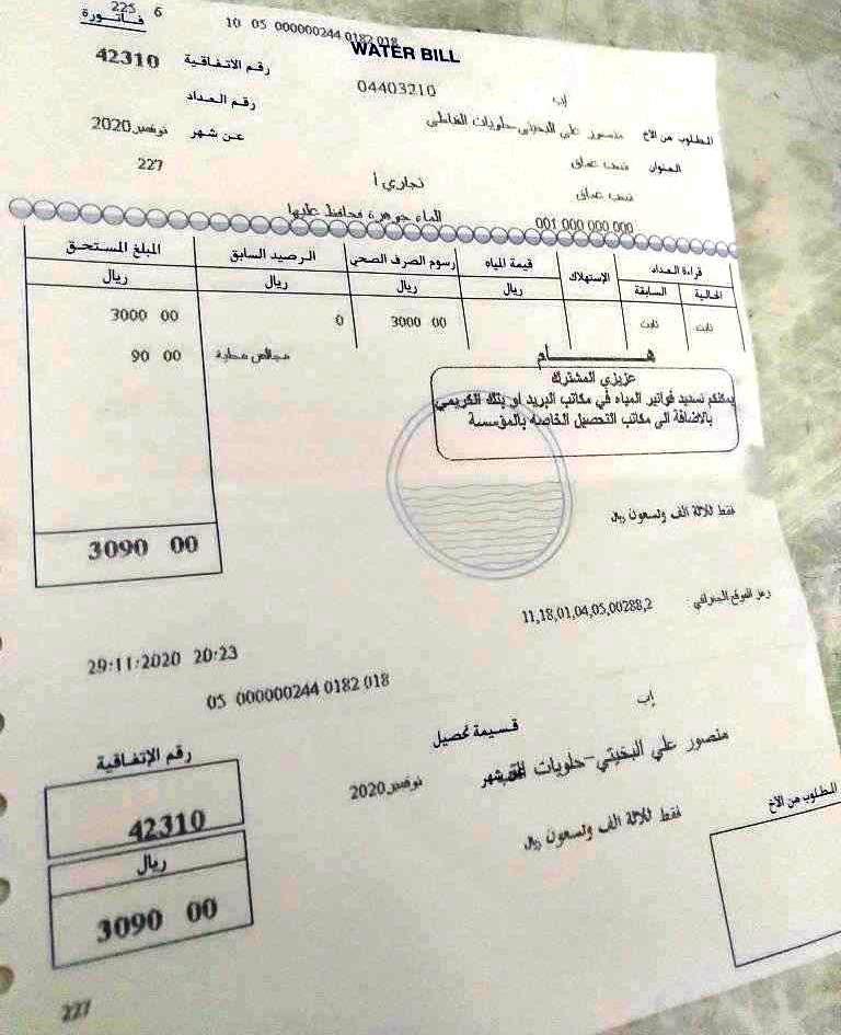 وتداول ناشطون في مدينة إب، عبر منصات التواصل الاجتماعي, صوراً لفواتير صادرة عن المؤسسة المحلية للمياه والصرف الصحي بالمحافظة، تسمى بفواتير رسوم الصرف الصحي، وتتراوح قيمتها ما بين ألفين إلى ثلاثة آلاف ريال، قامت المؤسسة بتوزيعها، مؤخراً، على بعض محلات الحلويات والبوفيات والمطاعم، وغيرها من المحال التجارية, دون أن تكون هذه المحلات لديها عدادات مياه تابعة للمؤسسة، وإنما يتزودون بالماء التجاري عبر الوايتات التجارية.