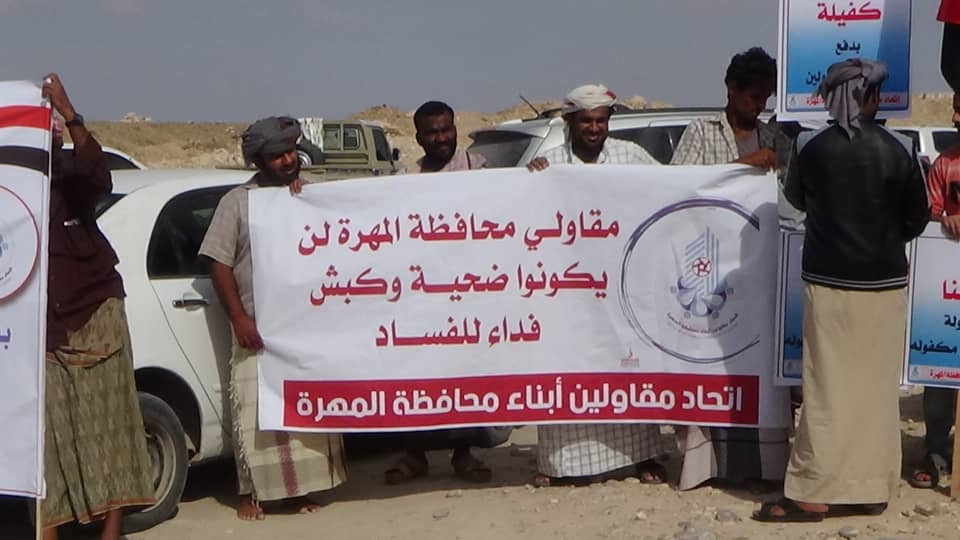 واحتشد العشرات من المقاولين، في مدينة الغيضة، رافعين لافتات، تطالب السلطة المحلية بدفع مستحقاتهم المالية المتأخرة لديها من المشاريع التي نفذوها في الفترة الماضية.