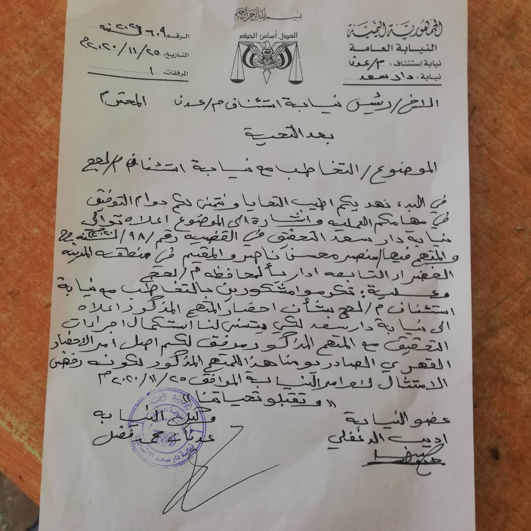 ناشد، سالم علي صالح ناصر الجعوني، مالك مزرعة، مديري الأمن في محافظتي عدن ولحج، التدخل وحمياته من الاعتداءات المتكررة التي يتعرض لها، وتدمير مزرعته الكائنة في منطقة جعولة، الواقعة في الأطراف الشمالية من مدينة عدن.