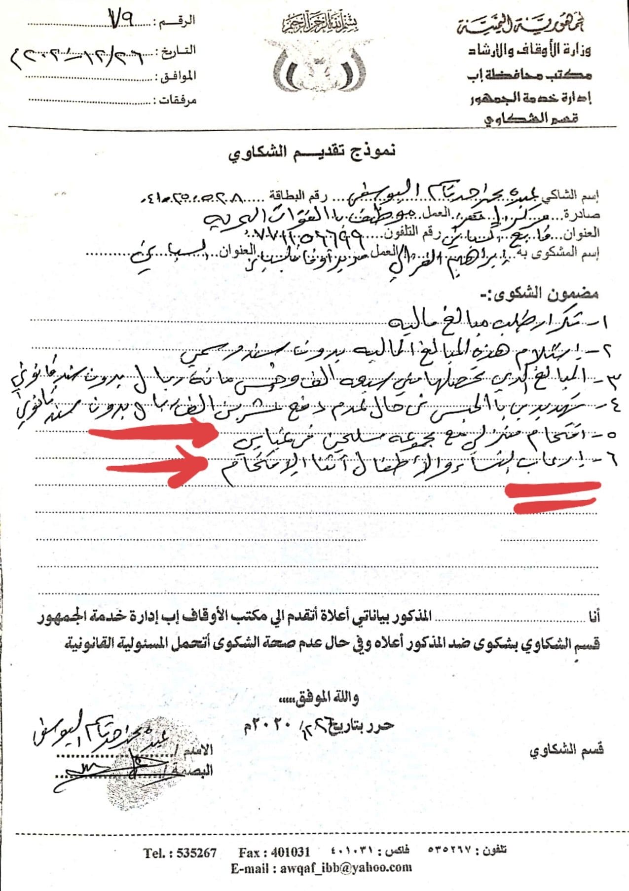 وأوضح، أن مدير أوقاف المديرية “كرر مطالبته بدفع مبالغ إضافية بدون سند رسمي، مقابل الأرض التي يستأجرها من مكتب الأوقاف، وهدده بالحبس في حال عدم دفعه المبلغ المطلوب منه وقدره عشرون ألف ريال”.