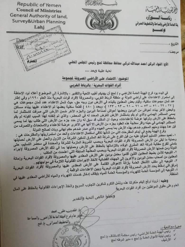 وحذر المهندس خلدون، في مذكرة له موجهة إلى محافظ لحج، من استمرار الاعتداءات على الأراضي المصروفة لأفراد قوات البحرية منذ عام 1990 في إطار الثمان المجموعات السكنية (27- 29- 51- 53- 71- 91- 93- 133) وبعدد (480) قطعة سكنية.