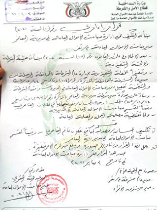وبحسب الوثيقة، (قرار التعيين)، فإن تعيين القاهري جاء بناءً على ترشيح وطلب من مدير شرطة المعافر.