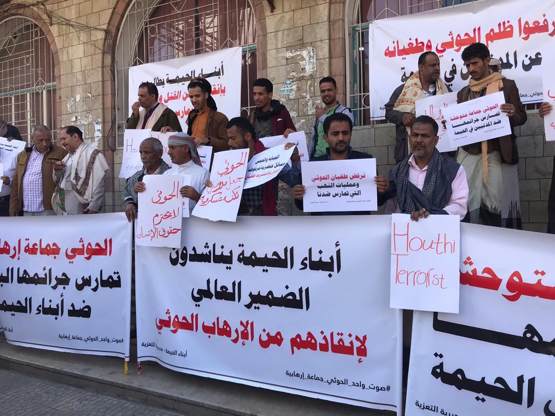 وندد المحتجون، في الوقفة التي شارك فيها العديد من أبناء عزلة الحيمة، الهجوم الحوثي على المدنيين في منطقة الحيمة التابعة لمديرية التعزية، وما ارتكبته بحق الأهالي من جرائم وممارسات إرهابية.