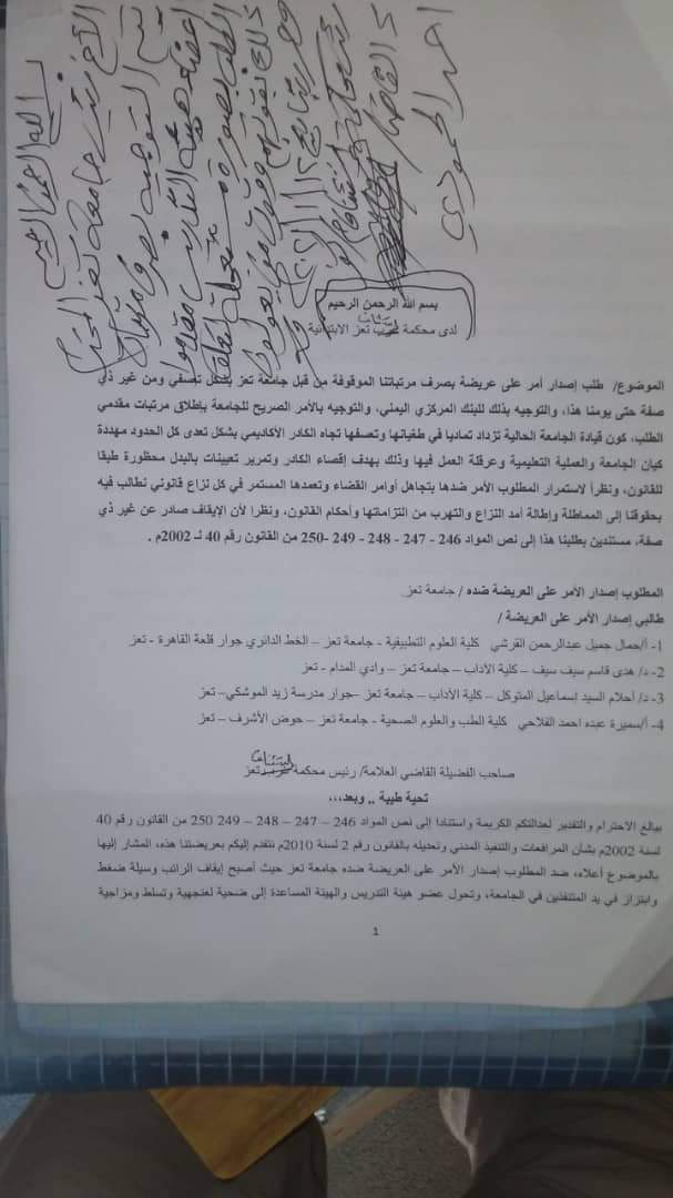 ورفع الموظفون المتضررون عريضة إلى رئيس محكمة استئناف تعز، أفادوا فيها، أن الجامعة أوقفت رواتبهم بصورة تعسفية، وطالبوا التوجيه الصريح للجامعة بإطلاق مرتباهم، كون قيادة الجامعة الحالية تزداد تمادياً في طغيانها وتعسفها تجاه الكادر الأكاديمي بشكل تعدى كل الحدود، مهددة كيان الجامعة والعملية التعليمية وعرقلة العمل فيها، حسب ما ورد في الشكوى.