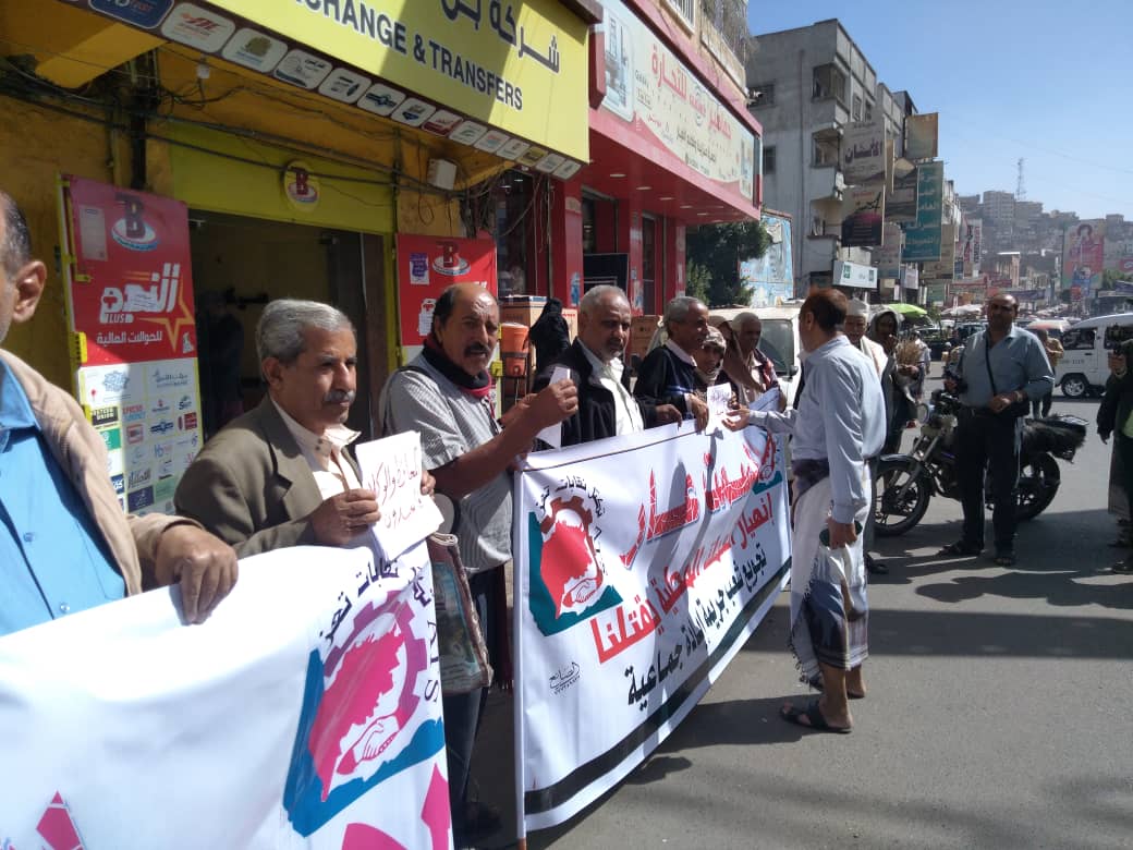 نفذ العشرات من النقابيين والناشطين، السبت، في مدينة تعز، وقفة احتجاجية دعا لها تكتل نقابات تعز، رفضاً للوضع العام المتدهور، والمطالبة بإجراء إصلاحات اقتصادية عاجلة.