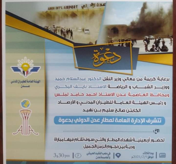 يشهد ملعب الشهيد الحبيشي، في العاصمة المؤقتة عدن، عصر غد الثلاثاء، الفعالية الرياضية لأربعينية شهداء مطار عدن الدولي.