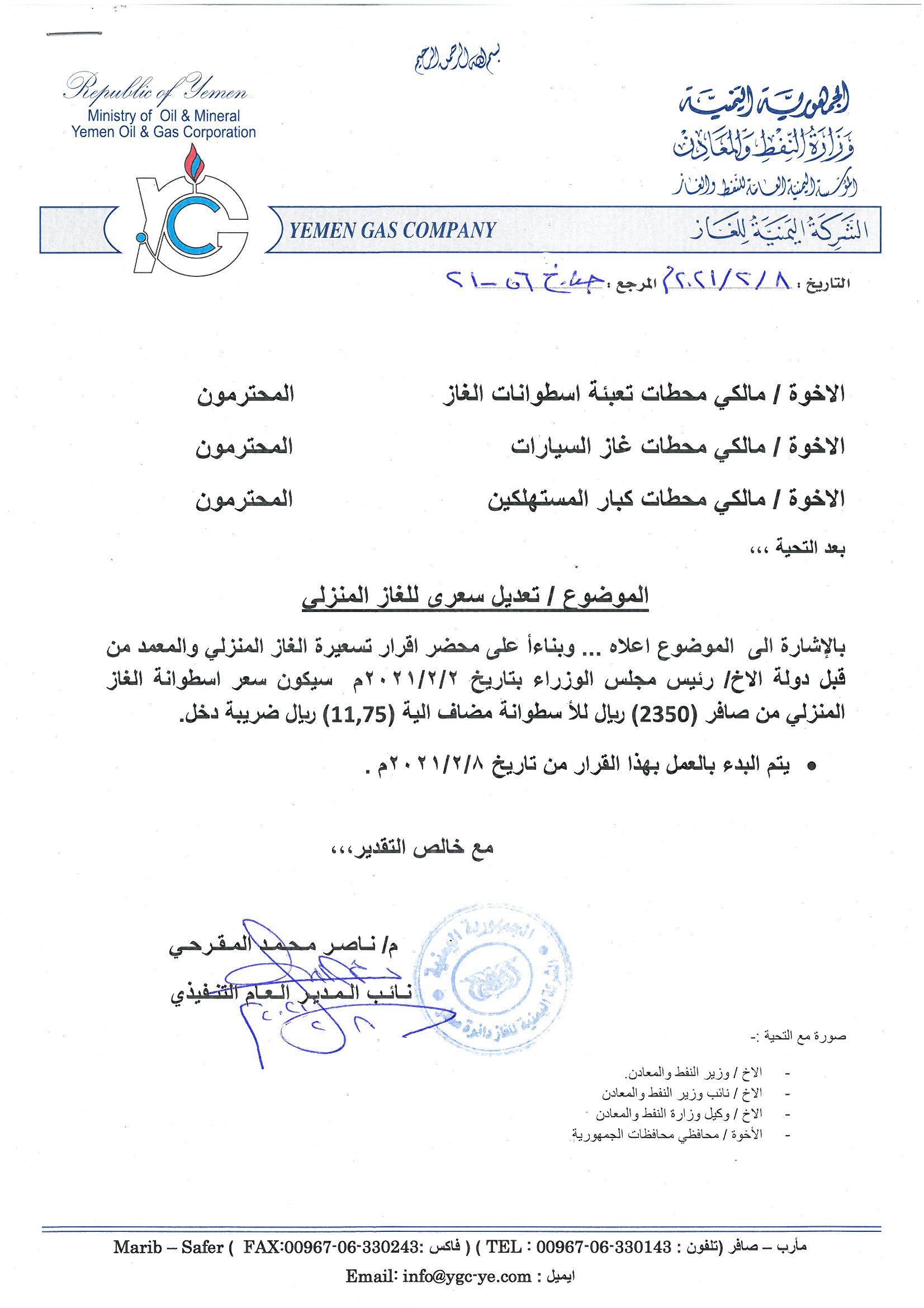 في السياق، عممت عمليات الشركة اليمنية للغاز في صافر، التسعيرة لجميع الوكلاء العمل بالتسعيرة الجديدة بدءاً من اليوم، متضمناً سعر البيع للمواطنين.