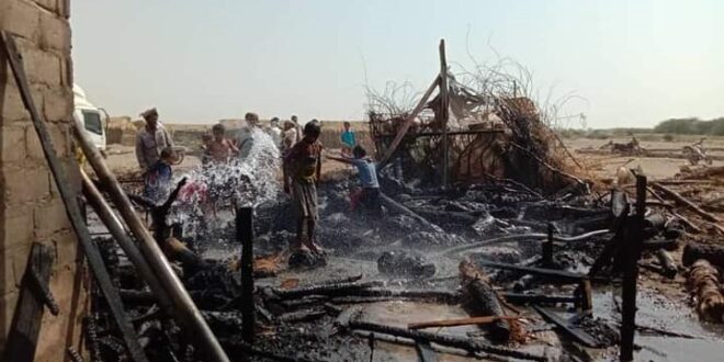 نشب حريق، أمس، في مخيم للنازحين بمدينة الخوخة، جنوب الحديدة.