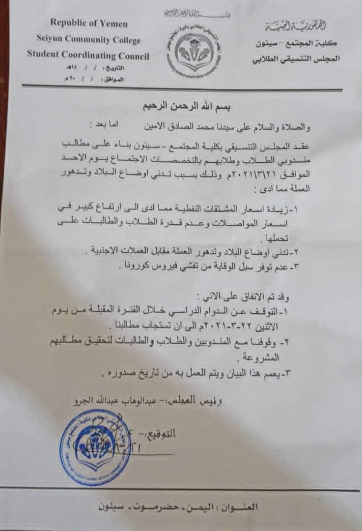 أعلن المجلس التنسيقي الطلابي بكلية المجتمع في مدينة سيئون بوادي حضرموت، الأحد، التوقف عن الدراسة ابتداءً من اليوم الاثنين، تضماناً مع المطالب التي رفعها طلاب الكلية إلى جانب قطاعات واسعة من العمال والموظفين، والمتمثلة بتخفيض سعر المشتقات النفطية، الذي تسببت بزيادة أجرة المواصلات، وإيقاف تدهور الأوضاع المعيشية.