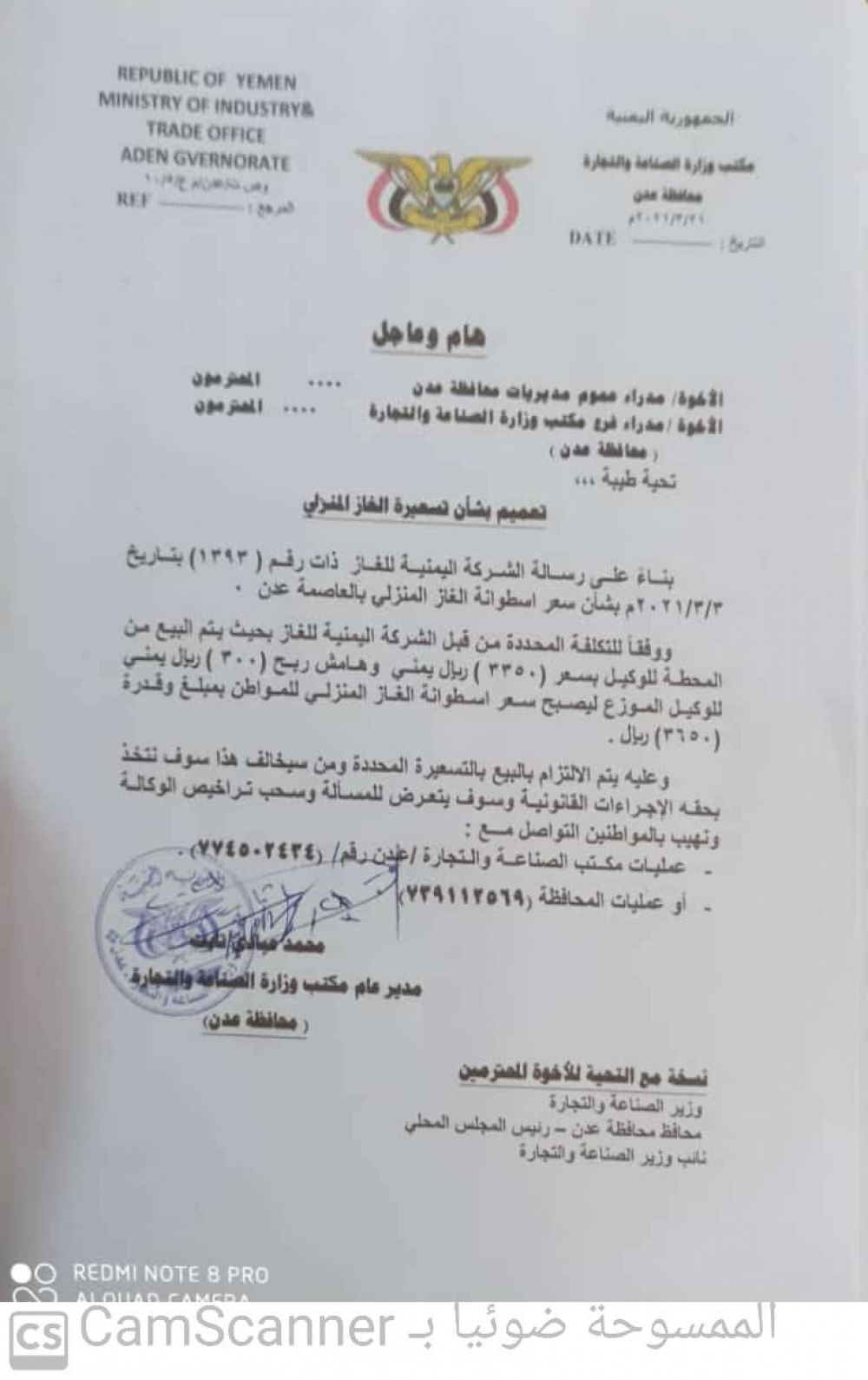 وأهاب التعميم، بجميع المواطنين التواصل والإبلاغ عن أي مخالفة على الأرقام التالية: عمليات مكتب الصناعة والتجارة 774502434 – عمليات مكتب محافظة عدن 739112569.