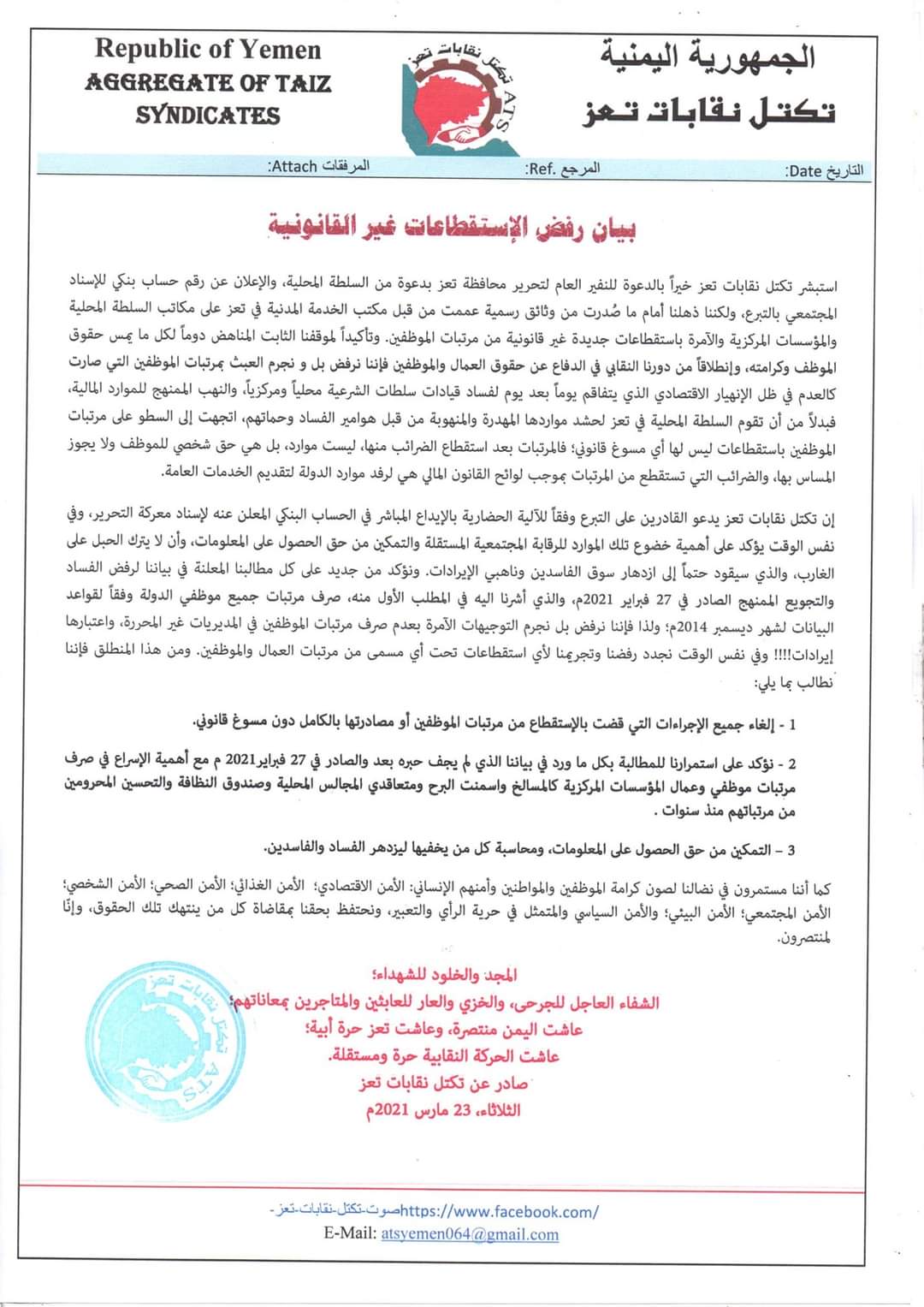 طالب تكتل نقابات تعز، السلطة المحلية، بإلغاء جميع الإجراءات التي قضت بمصادرة مرتبات موظفي المحافظة أو الاستقطاع منها.