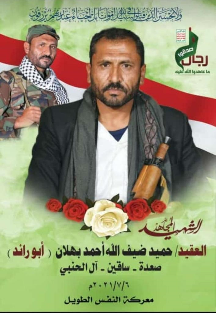 1 – القيادي الحوثي منتحل رتبة عميد حميد ضيف الله بهلان القائد العسكري مربع الضحاكي “مشرف (البيضاء والصومعة).