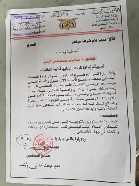 وقالت مصادر محلية لـ”الشارع”، إن إدارة شرطة تعز، رفضت توجيهات رئيس النيابة بتسليم المتهم عبدالواحد عبدالله القيسي، أحد جنود اللواء 170 دفاع جوي على ذمة اعتدائه بالرصاص والقنابل على منزل زيد طاهر علي بن علي الكائن في حي التوحيد بمنطقة عصيفرة، أصيب خلال ذلك طفل وتضررت سيارة شخص آخر بالرصاص.