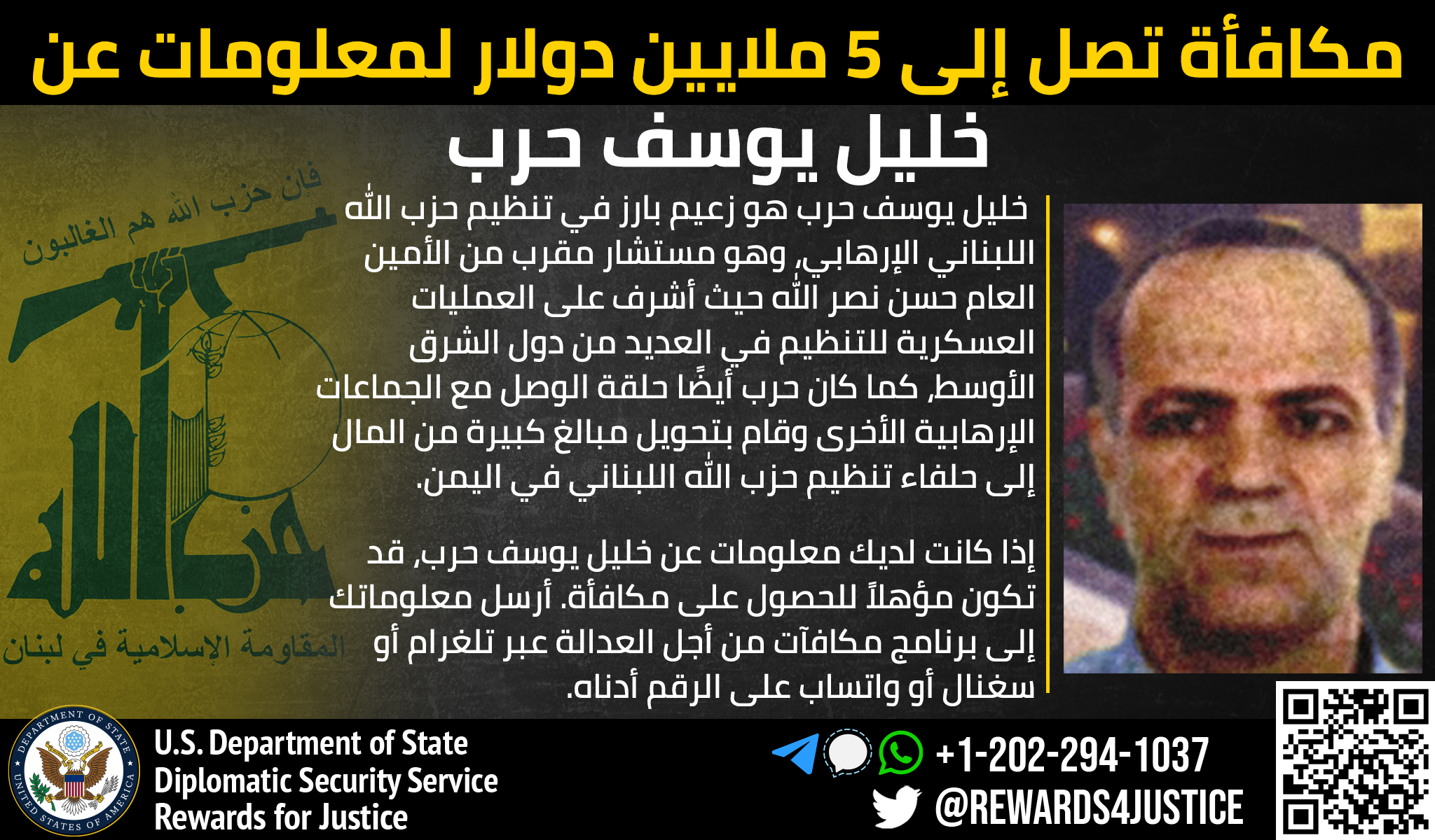عرضت الولايات المتحدة، خمسة ملايين دولار، لمن يدلي بمعلومات، عن القيادي في حزب الله اللبناني خليل يوسف حرب.