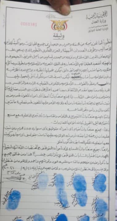 ووقعت الوثيقة، أمس الأول، من عدد من مشائخ وأعيان قرية “غضران” ومشرفين لمليشيا الحوثي في المنطقة، تحت ذريعة الغزو الفكري الذي ينتهجه “العدوان” بحسب ما ورد فيها.
