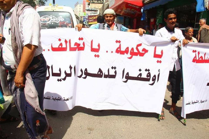 ورفع المحتجون شعارات تطالب دول التحالف والحكومة الشرعية، بوضع حدٍ لانهيار العملة الوطنية وغلاء الأسعار.