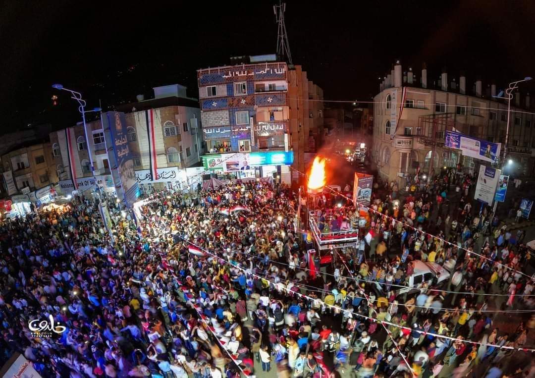 وفي تعز احتشد المئات من سكان المدينة، في حفل إيقاد شعلة الثورة، التي أوقدها أركان حرب محور تعز العسكري، العميد عبدالعزيز المجيدي، في شارع جمال وسط المدينة.
