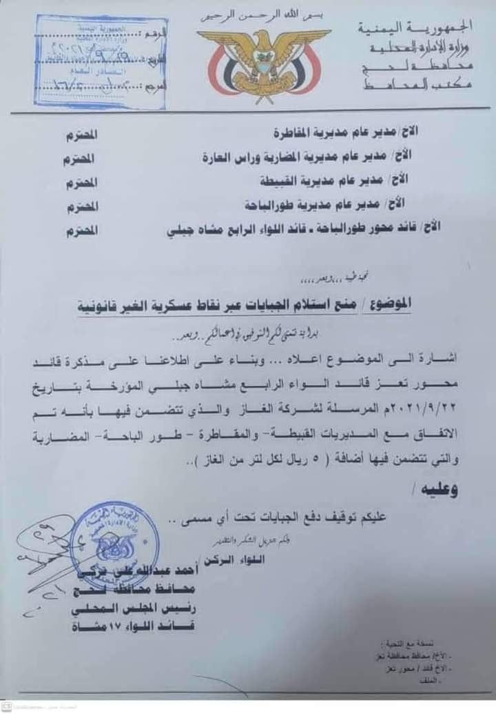 كما تأتي هذه المذكرة رداً على مذكرة قائد ما يسمى محور طور الباحة، قائد اللواء الرابع مشاة جبلي، أبو بكر الجبولي، التي وجهها في 22 سبتمبر الفائت، إلى “شركة الغاز والتي زعم فيها أنه تم الاتفاق مع السلطة المحلية في مديريات القبيطة ـ المقاطرةـ طور الباحةـ المضاربة، إضافة 5 ريال لكل لتر من مادة الغاز”.