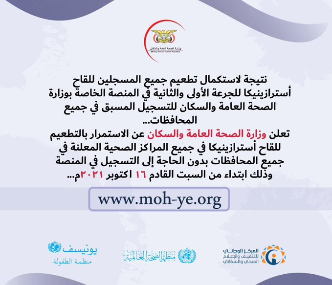 وسيبدأ التطعيم بلقاح “استرازينيكا”، يوم السبت القادم 16 أكتوبر الجاري، في جميع المراكز الصحية التي تم الاعلان عنها مسبقاً للتحصين ضد كورونا.