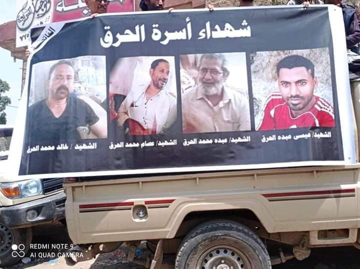 أكدت أسرة الحرق، أن الأجهزة الأمنية والمؤسسة العسكرية في تعز، لم تقبض على أفراد العصابة التي ارتكبت جريمة إبادة بحق أبنائها ونكلت بالأسرة وشردت رجالها.