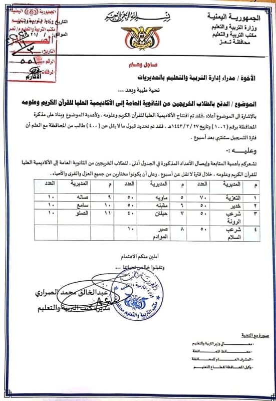 وسجلت مديريات “التعزية- الرونة- السلام- مقبنة- ماوية- وخدير” أعلى نسبة من الطلاب المطلوب التحاقهم في الاكاديمة الحوثية بأكثر من 300 طالب، مشددة على مدراء مكاتب التعليم في المديريات المذكورة أن يكون الطلاب مختارين من كل العزل والقرى.