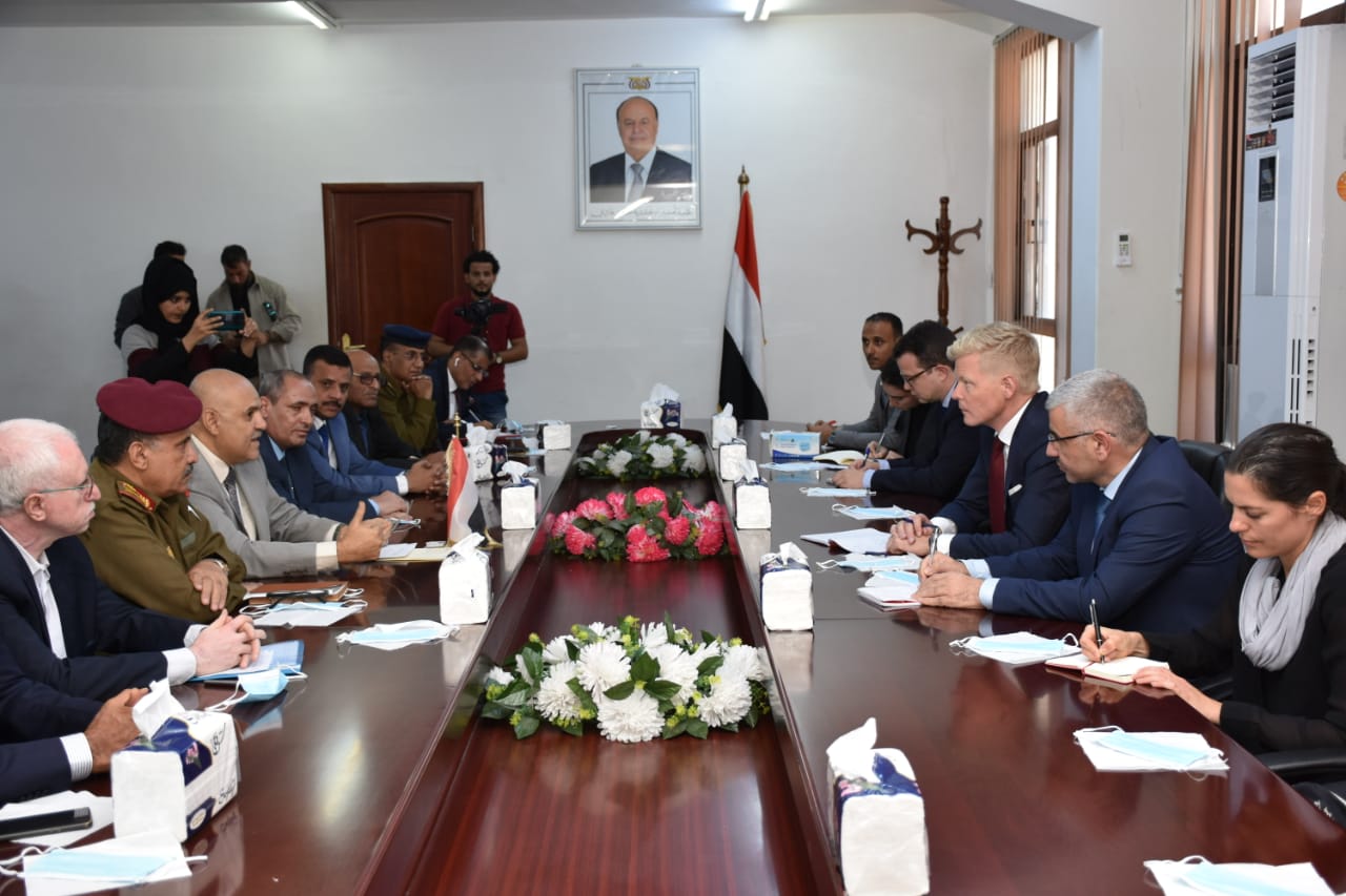 ناقش محافظ تعز نبيل شمسان ومعه وكلاء المحافظة، الاثنين، مع المبعوث الخاص للأمين العام للأمم المتحدة الى اليمن، هانس غروندبيرغ، الذي وصل إلى المحافظة ظهر اليوم، الأوضاع والمعاناة الانسانية التي تشهدها مدينة تعز، جراء الحرب والحصار الجائر للعام السابع من قبل مليشيا الحوثي الانقلابية.