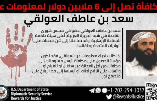 وقال بيان صادر عن برنامج “مكافآت من أجل العدالة”، في “توتير”: “تقدم مؤسسة مكافآت العدالة ما يصل إلى 6 ملايين دولار للحصول على معلومات تؤدي إلى تحديد هوية أو موقع سعد بن عاطف العولقي”.