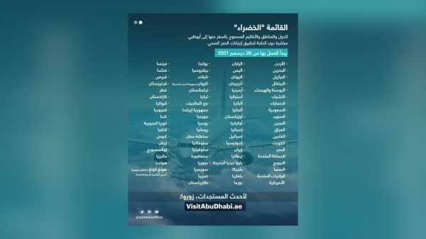 وتُضيف الإماراتُ الدول إلى القائمة الخضراء المسموح بالسفر منها إلى أراضيها بناء على تقييم الوضع الصحي فيها. حيث عادةً ما يتمُ إدراج الدول التي تشهد تعافيًا ملحوظًا من فيروس كورونا.