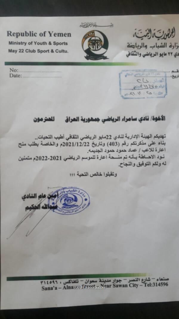 وقال بلاغ صحفي صادر عن النادي مساء أمس السبت، إن إدارة 22 مايو تلقت طلبا رسميا من نادي سامراء لاستعارة اللاعب.