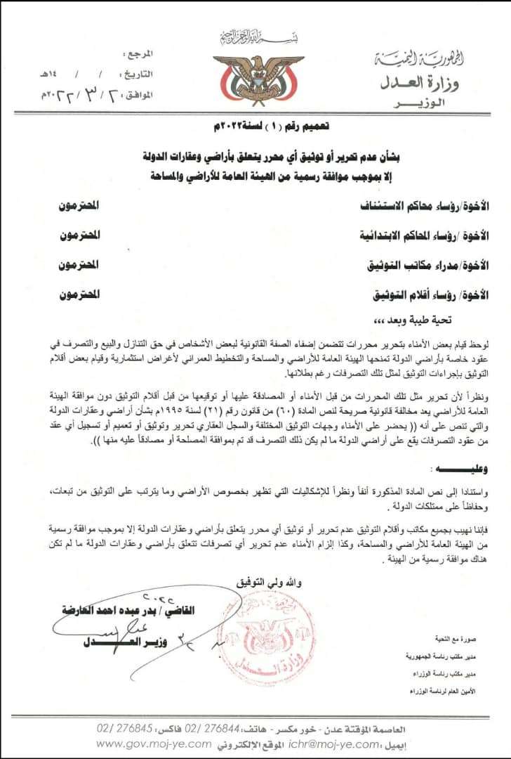 وجه وزير العدل، بدر عبده أحمد العارضة، المحاكم في اليمن بعدم توثيق أو تحرير أي وثائق وعقود بشأن التصرف بأراضي وعقارات الدولة، دون الموافقة الرسمية من الهيئة العامة للأراضي.
