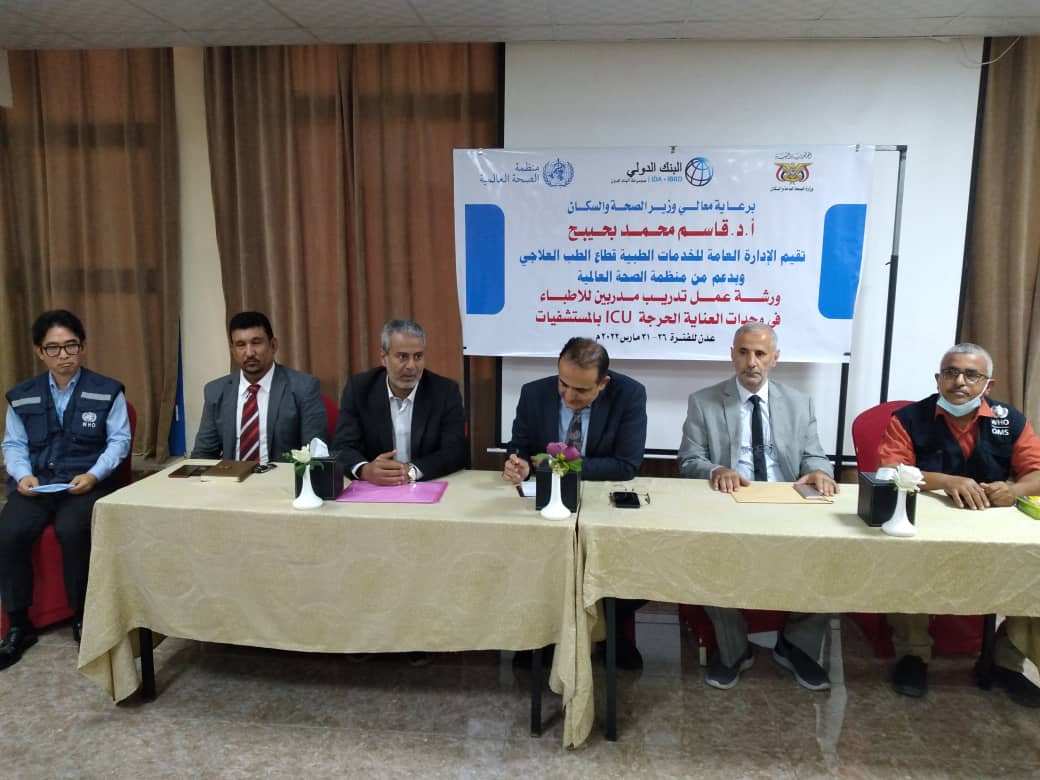 دشن وزير الصحة العامة والسكان قاسم بحيبح، اليوم الأحد، في عدن، الورشة التدريبية لمدربي أطباء وحدات العناية المركزة، التي تنظمها الإدارة العامة للخدمات الطبية بالوزارة، بدعم وتمويل منظمة الصحة العالمية.