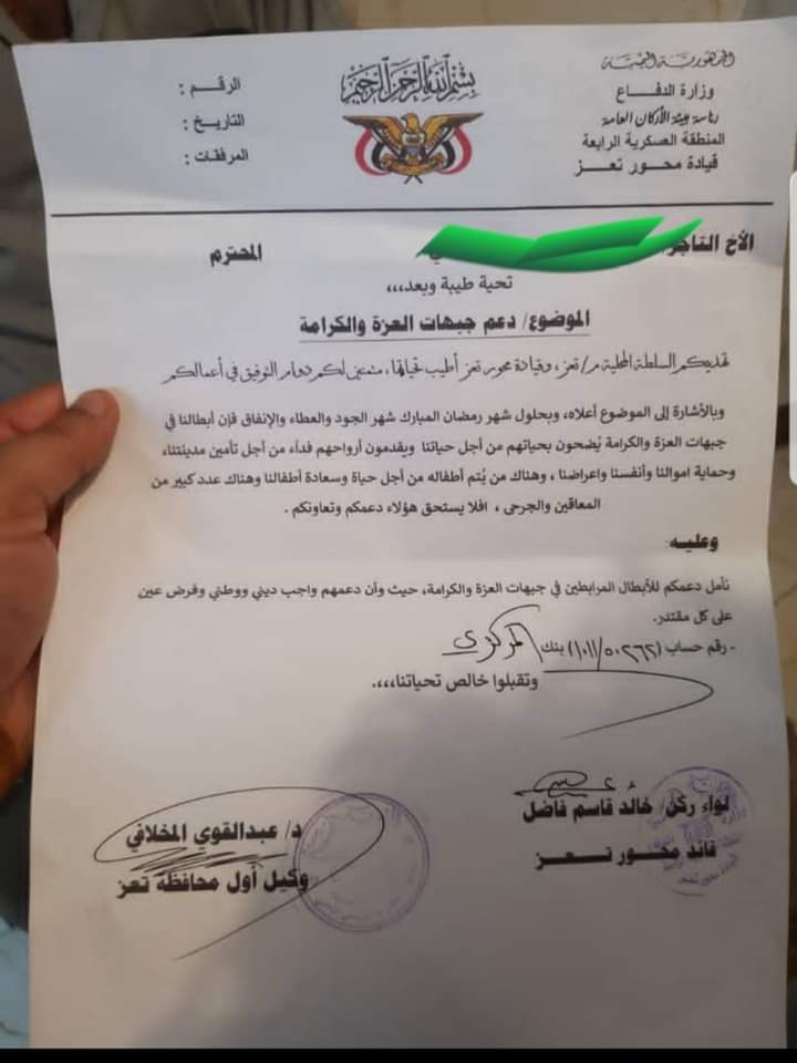 وحصلت “الشارع” على مذكرة صادرة من قيادة محور تعز وموقعة باسم قائد المحور اللواء الركن خالد فاضل ووكيل المحافظة عبد القوي المخلافي تطالب التجار بدعم جبهات القتال.