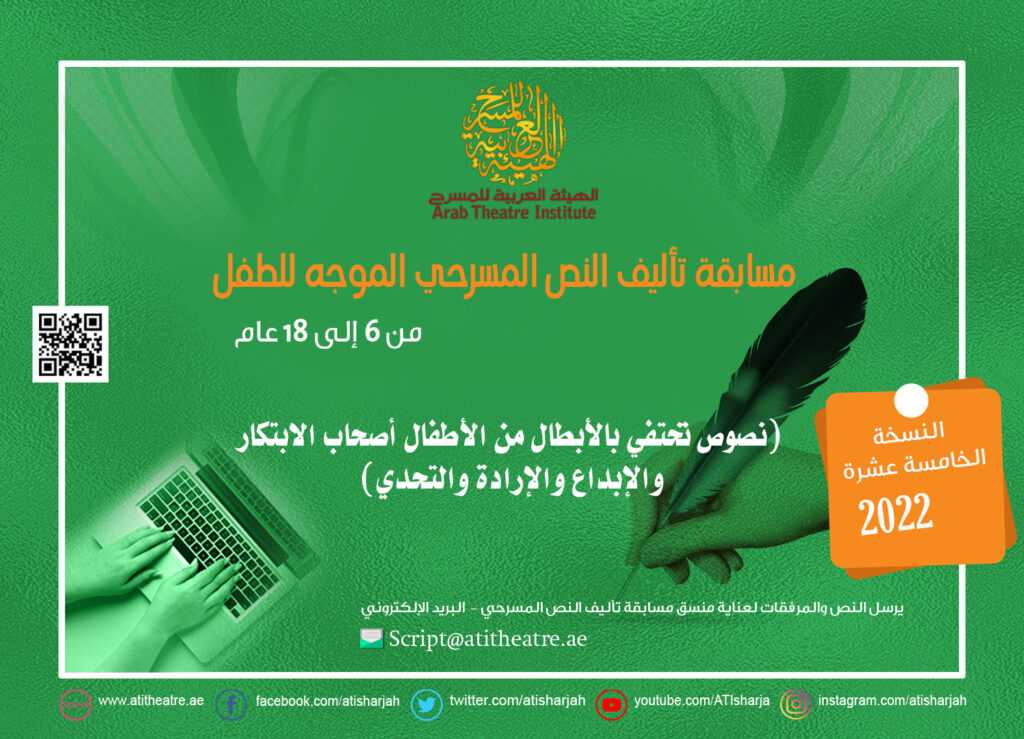 أعلنت الهيئة العربية للمسرح في الشارقة، عن شروط التقديم لمسابقتي التأليف المسرحي الموجه للأطفال بين سن (السادسة و18 عاما)، والموجه للكبار فوق 18 سنة، بنسختها الـ15 للعام الجاري 2022.