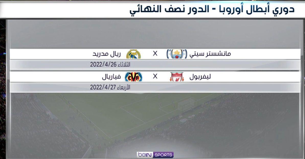 ويشهد نصف نهائي أبطال أوروبا صراعا إنجليزيا-إسبانيا إذ يلعب مانشستر سيتي ضد ريال مدريد يوم الثلاثاء 26 أبريل، فيما يلتقي ليفربول مع فياريال يوم الأربعاء 27 أبريل.