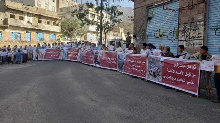نظم العشرات من أهالي مدينة تعز، الأحد، وقفة احتجاجية للمطالبة بفك الحصار الذي تفرضه مليشيا الحوثي الانقلابية على المدينة، منذ ثمان سنوات.