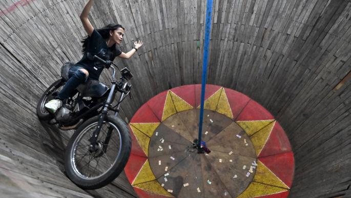 تقود كارميلا بوربا درّاجتها الهوائية تحت أضواء مدينة ملاهٍ ليليّة في إندونيسيا، متّخذةً مساراً أفقياً داخل برميل خشبي على شكل أسطوانة يسمى “برميل الشيطان”. وهي واحدة من إندونيسيات قليلات يقمن بهذا العرض البهلواني المسمّى جدار الموت.