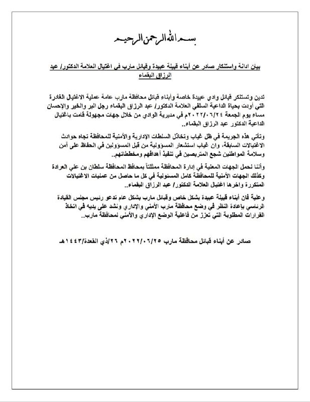 أدانت قبائل وادي عبيدة، بمحافظة مأرب، مقتل الداعية السلفي عبد الرزاق البقماء، متهمة السلطة المحلية بالمحافظة بالتهاون والتقصير تجاه حوادث الاغتيالات السابقة، وهو ما سبب باستمرارها.