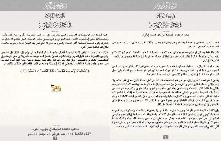 وقال التنظيم الإرهابي، في بيان منسوب له، متداول في عدد من وسائل الإعلام، إن الهجوم جاء “بعملية قام بها بصورة فردية بعض أفرادنا، وقتلوا فيها عدد من الجنود على خط أحور الساحلي، وقد خالفوا الأوامر الواضحة بعدم القيام بأي عمل ضد حكومة شقرة بهذه المرحلة وذلك من باب السياسة الشرعية”.