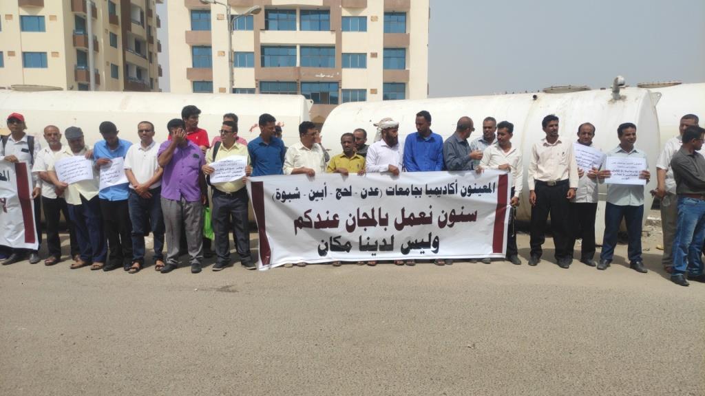نفذ أعضاء هيئة التدريس المعينين أكاديميا في أربع جامعات حكومية، اليوم الثلاثاء، وقفة احتجاجية في العاصمة المؤقتة عدن، للمطالبة بالتعزيز المالي وتسوية درجاتهم الوظيفية.
